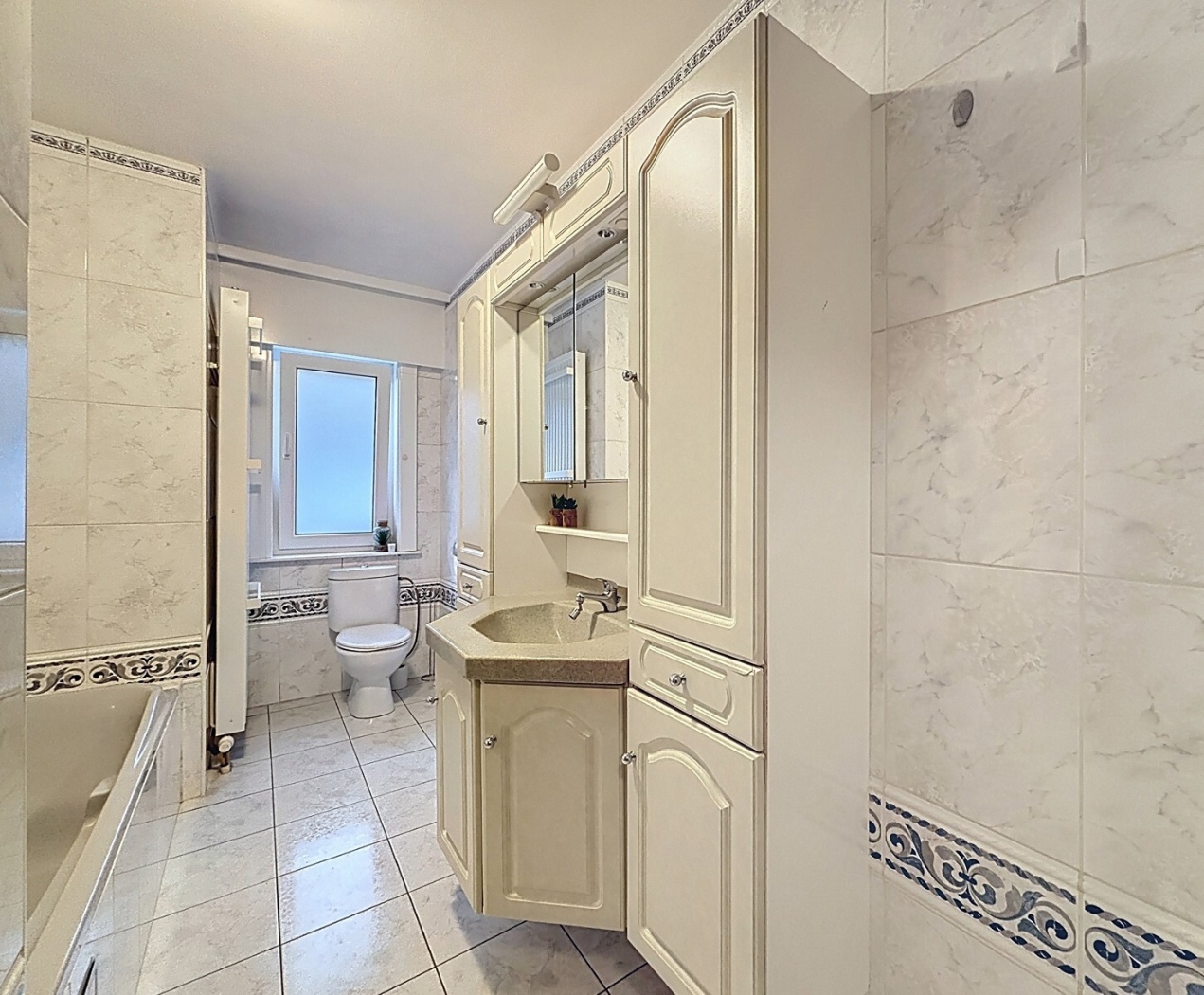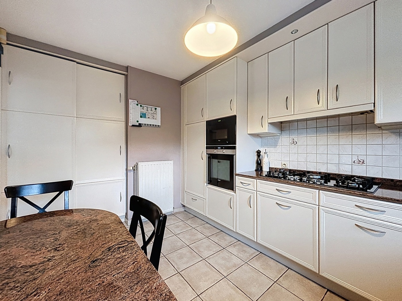 La villa se compose: au rez-de-chaussée: un hall d'entrée avec toilette, un séjour lumineux avec accès à la terrasse ensoleillée et le jardin, cuisine entièrement équipée, salle de bains avec baignoire, douche, lavabo en meuble et toilette; chambre à coucher, espace bureau et grand débarras avec raccordements machine à laver et séchoir. A l'étage: 2 chambres à coucher spacieuses, hall de nuit avec rangement et une deuxième salle de bains avec double lavabo, baignoire, douche et toilette. Le grenier est accessible par une trappe d'escalier. Chauffage central au gaz avec chaudière à condensation , 12 panneaux solaires et deux citernes d'eau de 15.000 litres.